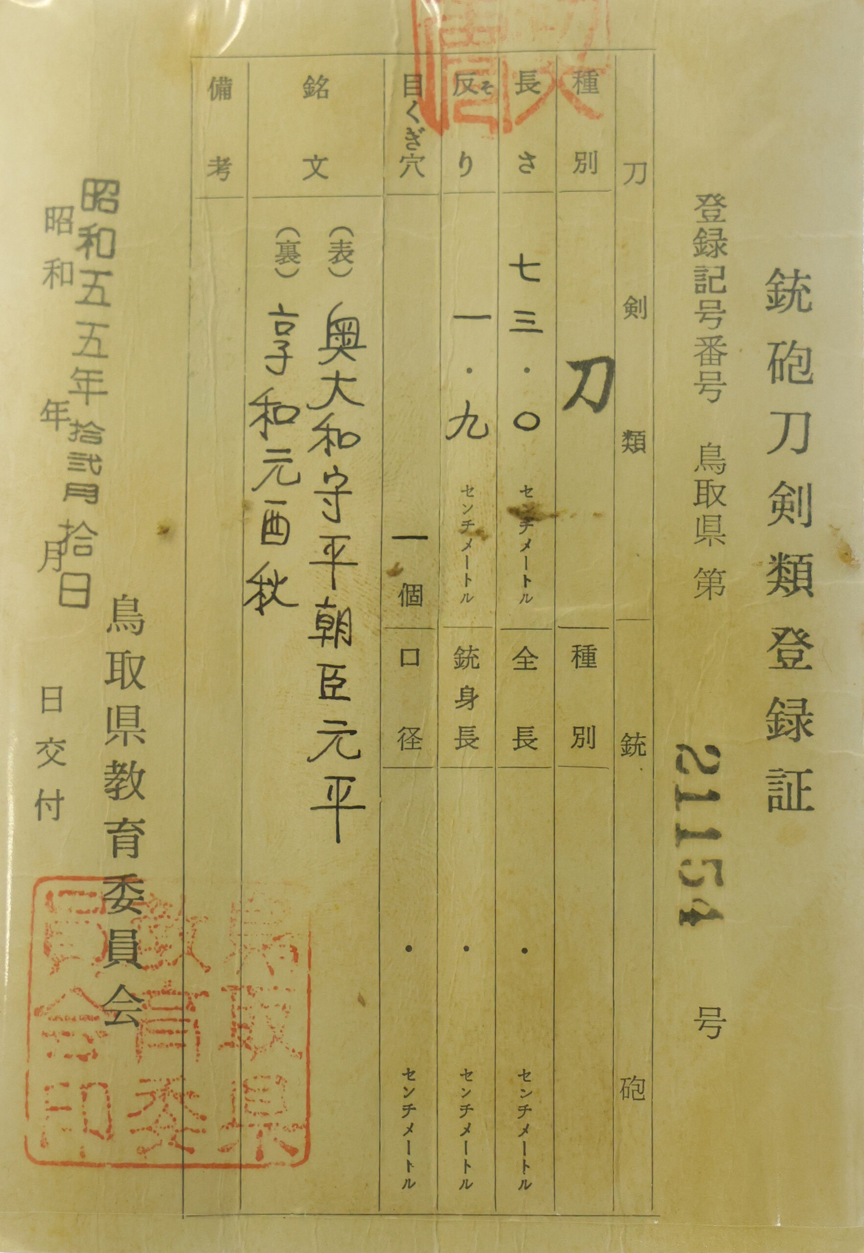 The Board of Education in Tottori prefecture issued a registration paper for this sword . It is called Jyu Token Rui Torokusho (銃刀剣類登録証). Bunkacho (The Agency for Cultural Affairs) acknowledges a Japanese sword with this paper as a work of art.